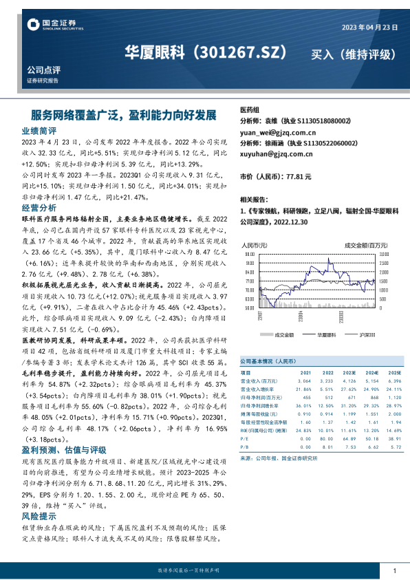 华厦眼科2022年业绩表现稳健,2023年一季度延续增长势头。公司眼科医疗服务网络覆盖范围广,主要业务地区增长稳健,视光屈光业务占比提升。通过医教研协同发展,公司科研实力不断增强。毛利率稳步提升,盈利能力持续向好。维持对公司未来业绩增长的乐观预期和“买入”评级,但同时也提示了相关风险。