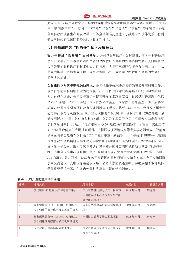 公司致力于推进“医教研”协同发展体系。依托临床诊疗案例积累开展科研工作,已申请和开展多项国家级、省部级科研课题,截至2020年末取得专利授权87项,登记软件著作权161项。2022年度新增专利授权13项、软件著作权12项,获批医学科研项目42项,参与和开展各类临床试验项目24项,发表学术论文126篇(SCI收录55篇)。