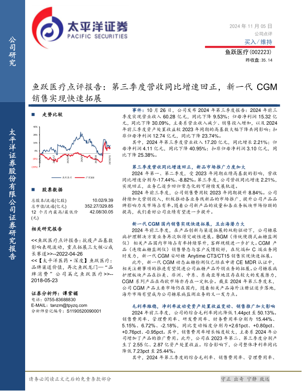 鱼跃医疗在2024年第三季度实现了营收同比增速回正,标志着公司业务逐步回归常态化可持续发展轨道。尽管前三季度整体业绩受高基数及销售投入增加影响有所下滑,但新一代连续血糖监测仪(CGM)在国内市场的快速拓展及海外市场的巨大潜力,预示着公司未来业绩的强劲增长动能。公司持续加大营销投入,推动新品上市,并积极布局全球市场,有望在糖尿病护理等核心业务领域取得突破。