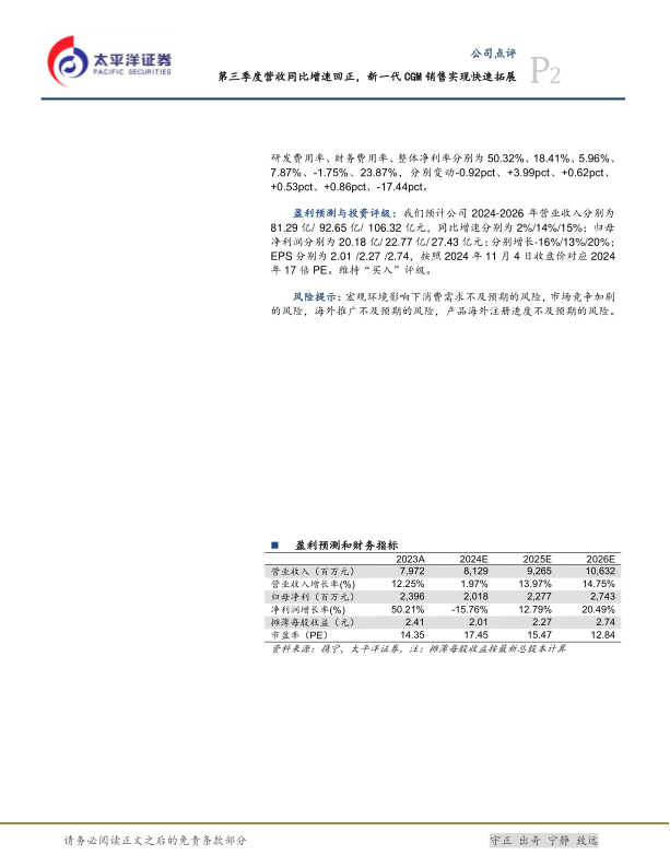 报告分析显示,公司毛利率保持稳定,但净利率受2023年同期资产处置收益高基数和2024年销售推广费用增加的双重影响而波动。尽管短期净利润承压,但从长期来看,随着新产品放量和市场份额提升,以及费用投入效益的逐步显现,公司盈利能力有望恢复并持续增长。太平洋证券维持“买入”评级,并对公司未来三年的营收和归母净利润给出了积极的增长预测,凸显了其长期投资价值。