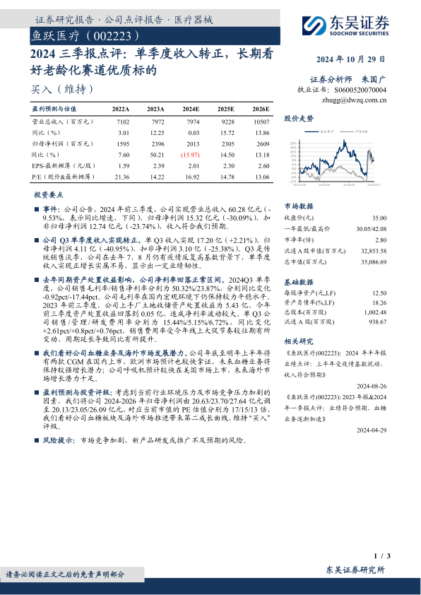 分析师对鱼跃医疗的长期发展持乐观态度,认为公司作为老龄化赛道的优质标的,其在医疗器械领域的深耕和创新将持续受益于人口结构变化带来的市场需求。尽管短期内面临行业竞争和新产品推广的风险,但公司通过产品创新和市场拓展,有望克服挑战,实现稳健增长。维持“买入”评级,体现了市场对公司未来盈利能力和长期投资价值的信心。