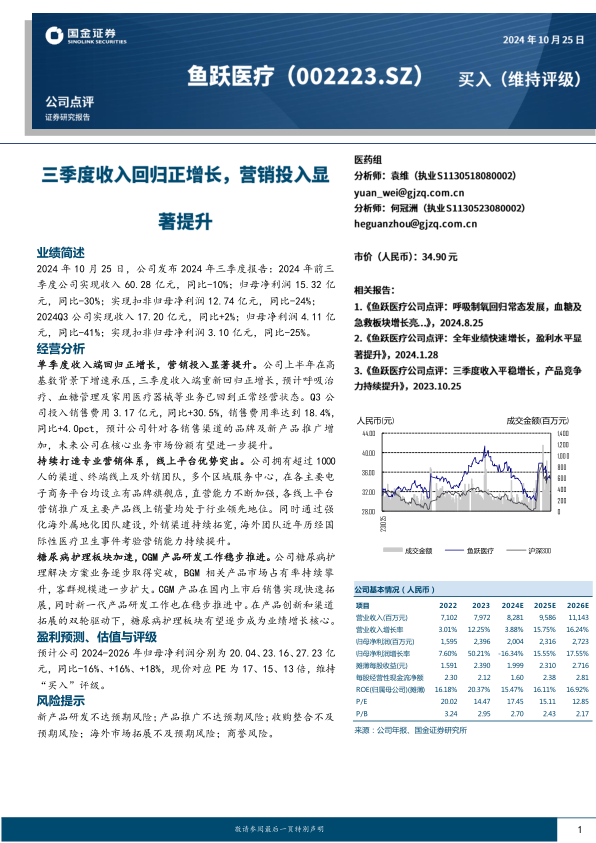 本报告分析了鱼跃医疗2024年三季度业绩,指出公司整体业绩虽短期承压,但单季度收入已恢复增长。公司加大营销投入,线上平台优势明显,糖尿病护理板块加速发展,未来业绩有望持续增长。维持“买入”评级,但需关注新产品研发、市场推广、海外拓展等风险。