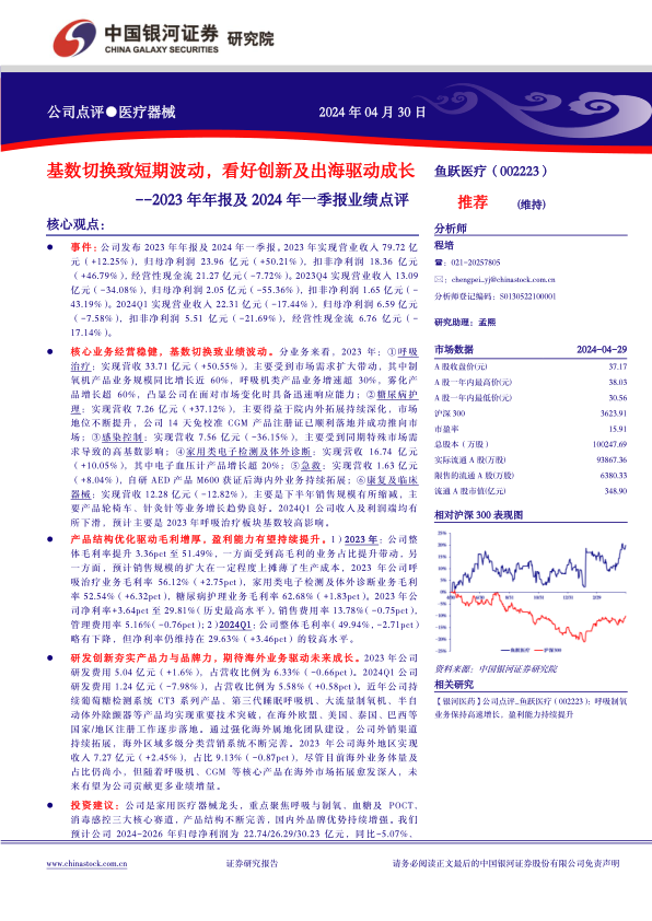核心业务经营稳健,基数切换致业绩波动。分业务来看,2023年:①呼吸治疗:实现营收33.71亿元(+50.55%),主要受到市场需求扩大带动,其中制氧机产品业务规模同比增长近60%,呼吸机类产品业务增速超30%,雾化产品增长超60%,凸显公司在面对市场变化时具备迅速响应能力;②糖尿病护理:实现营收7.26亿元(+37.12%),主要得益于院内外拓展持续深化,市场地位不断提升,公司14天免校准CGM产品注册证已顺利落地并成功推向市场;③感染控制:实现营收7.56亿元(-36.15%),主要受到同期特殊市场需求导致的高基数影响;④家用类电子检测及体外诊断:实现营收16.74亿元(+10.05%),其中电子血压计产品增长超20%;⑤急救:实现营收1.63亿元(+8.04%),自研AED产品M600获证后海内外业务持续拓展;⑥康复及临床器械:实现营收12.28亿元(-12.82%),主要是下半年销售规模有所缩减,主要产品轮椅车、针灸针等业务增长趋势良好。2024Q1公司收入及利润端均有所下滑,预计主要是2023年呼吸治疗板块基数较高影响。