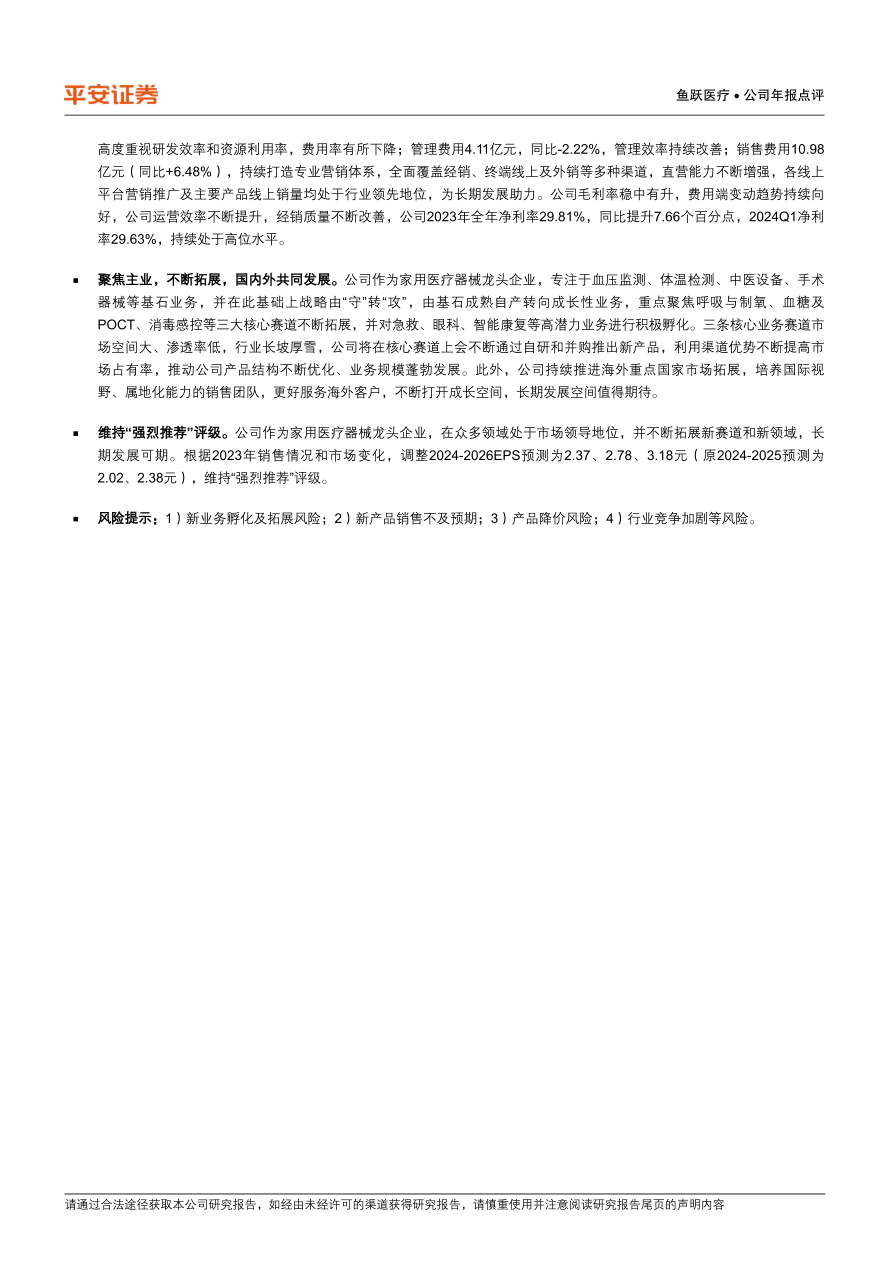 鱼跃医疗2023年业绩增长符合预期,公司通过优化产品结构、控制成本费用、聚焦核心赛道以及拓展国内外市场,实现了盈利能力的提升和业务的稳健发展。虽然2024年一季度受高基数影响收入有所下滑,但全年增长可期。公司作为家用医疗器械龙头企业,在多个领域处于市场领导地位,并不断拓展新赛道和新领域,长期发展空间值得期待,维持“强烈推荐”评级。