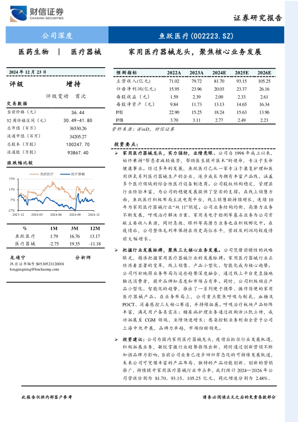 鱼跃医疗作为国内家用医疗器械龙头企业,凭借其深厚的行业积累、多元化的产品布局和前瞻性的战略眼光,在市场中展现出强大的竞争优势。公司通过持续的收并购和自主研发,不断拓展业务边界,尤其在呼吸与制氧、糖尿病护理和感染控制三大核心业务领域取得了显著进展。公司敏锐捕捉家用医疗器械行业线上化、小型化、智能化的发展趋势,并成功将其融入产品创新和营销策略中,实现了业绩的稳健增长和盈利能力的持续提升。尽管面临行业竞争加剧、研发失败、国际贸易摩擦及商誉减值等潜在风险,但公司凭借其强大的品牌影响力、丰富的产品矩阵和创新的营销推广,有望在未来持续提升市场占有率,保持可持续发展轨道。财信证券基于对公司未来发展的积极预期,给予“增持”评级。