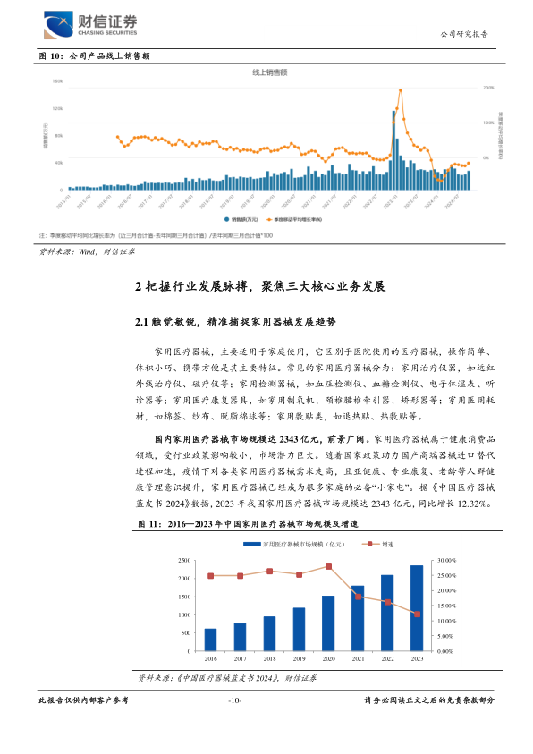 把握行业发展脉搏,聚焦三大核心业务发展。公司凭借前瞻性的战略眼光,精准把握家用医疗器械行业的发展脉搏。家用医疗器械行业正经历着显著的变革,线上销售、产品小型化、智能化成为核心趋势。公司巧妙地将业务布局与这些趋势深度融合,通过线上平台更直接地触达消费者,提升品牌知名度和市场占有率。同时,公司积极顺应产品小型化、智能化的趋势,推出了一系列便于携带、操作简便的家用医疗器械产品。在业务布局上,公司重点聚焦呼吸与制氧、血糖及POCT、消毒感控三大核心赛道,并持续拓展。呼吸治疗板块产品矩阵丰富,满足用户各类需求;糖尿病护理业务通过收购浙江凯立特,成功拓展至CGM领域,业绩快速增长;感染控制业务则由全资子公司上海中优开展,品牌力卓越,市场份额领先。