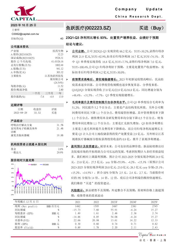 盈利预计及投资建议:展望未来,公司良好的品牌价值、新品陆续推出以及院端市场的开拓将助力公司长远的发展。考虑到短期计入非经常损益较多,我们相应上调盈利预测,预计公司2023-2025分别实现净利润24.9亿元、23.8亿元、27.5亿元,yoy分别+55.9%、-4.2%、+15.3%(原预计公司2023-2025分别实现净利润20.0亿元、23.0亿元、26.3亿元,yoy分别+25.1%、+15.2%、+14.5%),折合EPS分别为2.5元、2.4元、2.7元。当前股价对应的PE分别为14倍、14倍、12倍,疫后公司净利端仍维持快速增长,我们维持“买进”的投资建议。