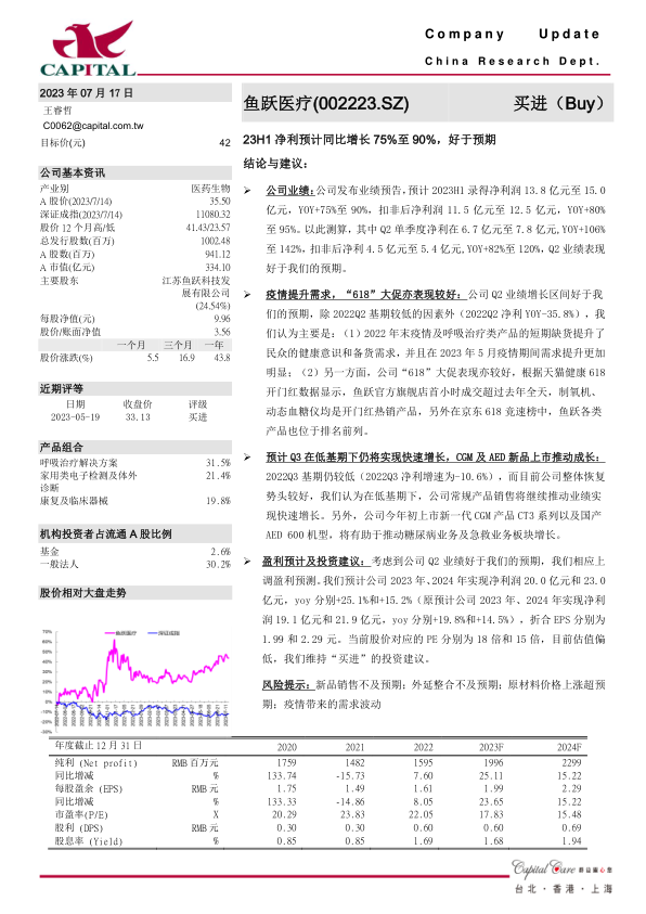 疫情提升需求,“618”大促亦表现较好:公司Q2业绩增长区间好于我们的预期,除2022Q2基期较低的因素外(2022Q2净利YOY-35.8%),我们认为主要是:(1)2022年末疫情及呼吸治疗类产品的短期缺货提升了民众的健康意识和备货需求,并且在2023年5月疫情期间需求提升更加明显;(2)另一方面,公司“618”大促表现亦较好,根据天猫健康618开门红数据显示,鱼跃官方旗舰店首小时成交超过去年全天,制氧机、动态血糖仪均是开门红热销产品,另外在京东618竞速榜中,鱼跃各类产品也位于排名前列。