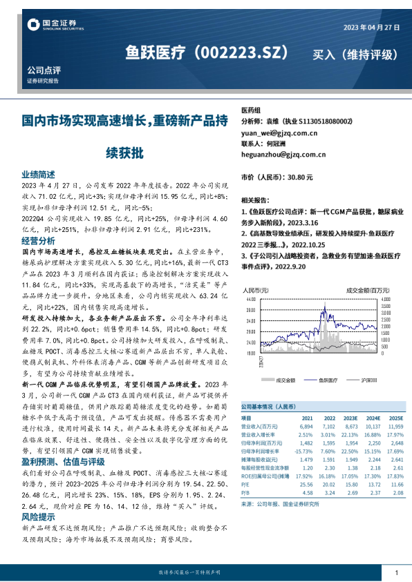 2022年,公司在复杂市场环境下实现了收入和归母净利润的稳健增长,尤其在国内市场展现出强劲的增长势头。感染控制和糖尿病护理解决方案等核心业务板块表现突出,成为业绩增长的重要驱动力。公司持续加大研发投入,新一代CGM产品CT3的成功获证,预示着公司在关键赛道上的创新能力和市场潜力。尽管面临新产品研发推广、收购整合、海外市场拓展及商誉等风险,但机构对公司未来在呼吸制氧、血糖及POCT、消毒感控三大核心赛道的潜力持乐观态度,并维持“买入”评级,预计未来几年公司归母净利润将持续增长。