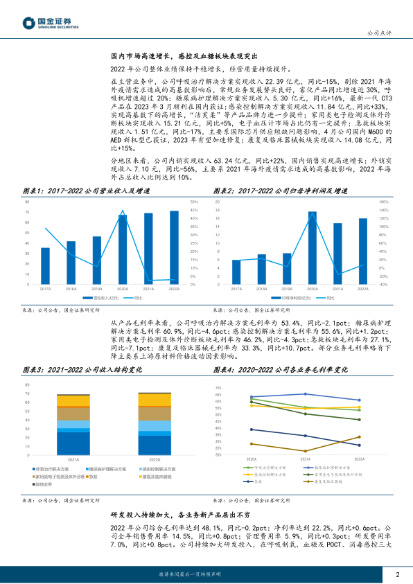 研发投入持续加大,各业务新产品层出不穷。公司全年净利率达到22.2%,同比+0.6pct;销售费用率14.5%,同比+0.8pct;研发费用率7.0%,同比+0.8pct。公司持续加大研发投入,在呼吸制氧、血糖及POCT、消毒感控三大核心赛道新产品层出不穷,单人氧舱、便携式制氧机、外科体表消毒产品、CGM等新产品创新研发项目众多,有望为公司持续贡献业绩增长。