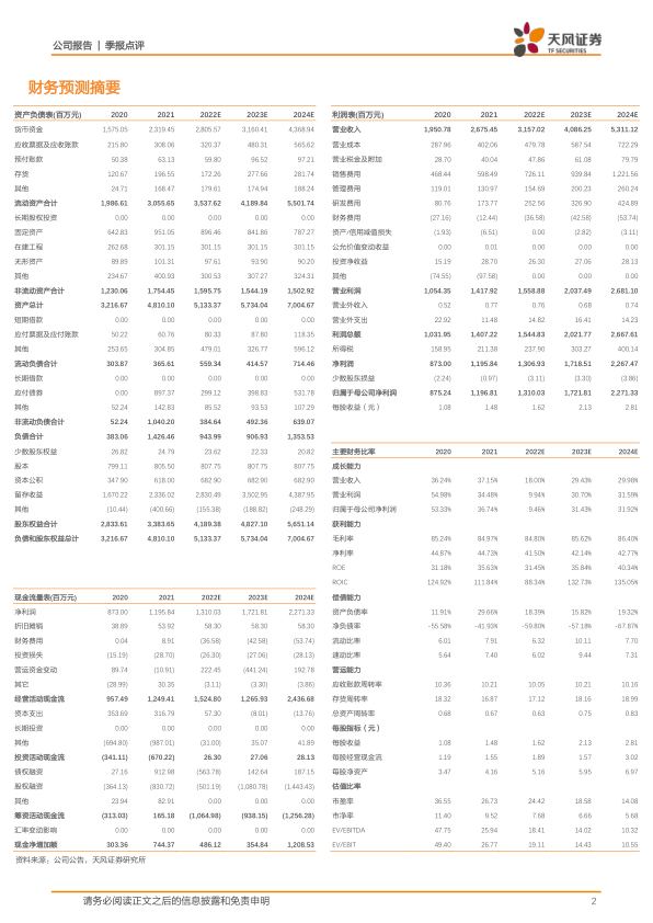 盈利预测: 考虑到疫情对公司业务开展的影响, 我们相应下调未来三年盈利预测, 预计公司 2022-2024 年营业收入分别为 31.57/40.86/53.11 亿元(前值为 36.01/48.70/65.89 亿元),归母净利润分别为 13.10 /17.22/22.71 亿元(前值为 16.36/22.16/29.93 亿元),维持“买入”评级。
