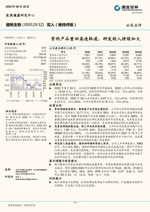 健帆生物2022年上半年业绩表现良好,肾科产品是主要增长动力,危重症领域拓展迅速,研发投入持续加大。国金证券看好公司在血液净化领域的发展前景,维持“买入”评级,但同时也提示了新产品研发、医保控费、产能建设和产品推广等方面的风险。