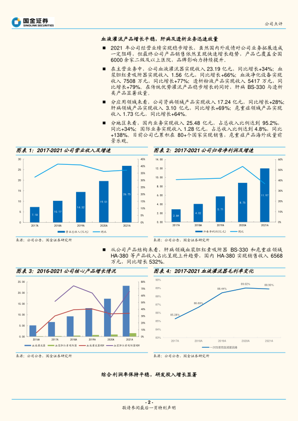本报告核心观点指出,健帆生物在2021年实现了营业收入和归母净利润的稳健增长,同比增幅均达到37%左右,显示出公司强大的盈利能力和市场扩张潜力。同时,公司显著加大了研发投入,研发费用同比增长115.2%,研发费用率提升2.36个百分点至6.50%,这表明公司正积极通过技术创新驱动未来发展,并致力于拓展血液净化领域的产品线。