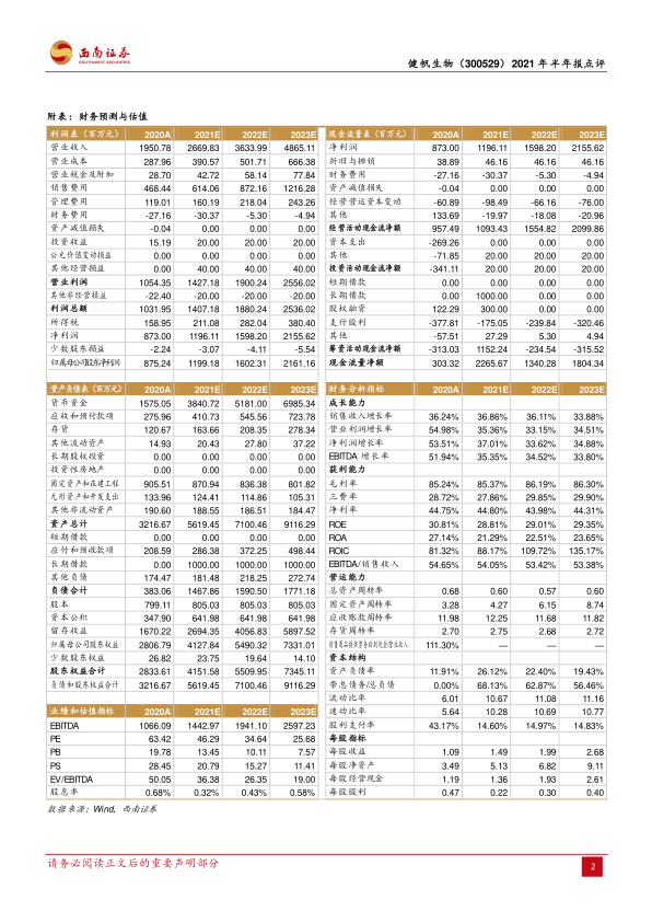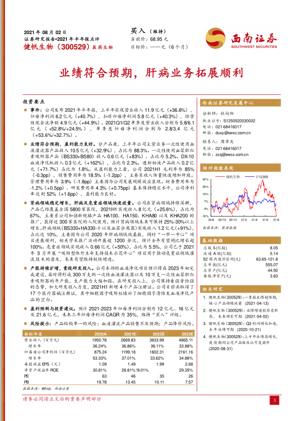 健帆生物2021年上半年业绩符合预期,盈利能力良好。公司在肾病领域保持稳定增长的同时,积极拓展肝病和危重症领域,为未来发展注入新的动力。公司持续扩增产能,重视研发投入,有望保持长期稳定增长。维持“买入”评级。