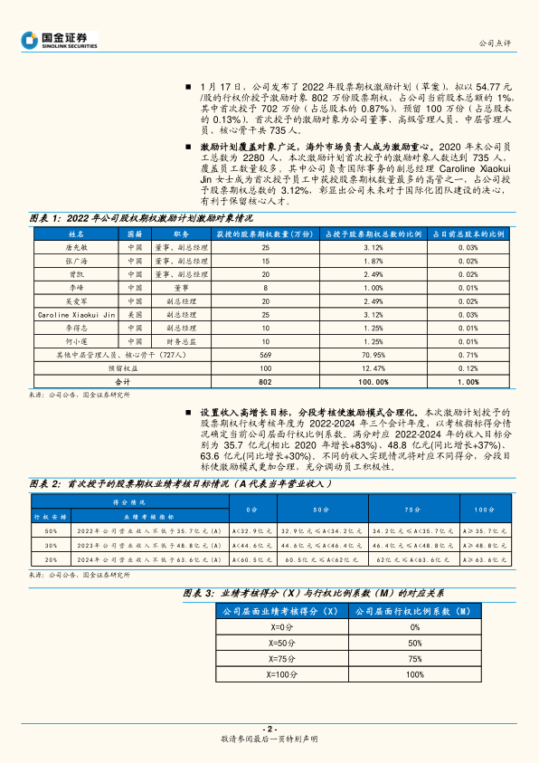 激励计划覆盖对象广泛,海外市场负责人成为激励重心。激励计划首次授予的激励对象人数达到735人,覆盖员工数量较多。其中负责公司国际事务的副总经理CarolineXiaokuiJin女士成为首次授予员工中获授股票期权数量最多的高管之一,占公司授予股票期权总数的3.12%,彰显出公司未来对于国际化团队建设的决心,有利于保留核心人才。