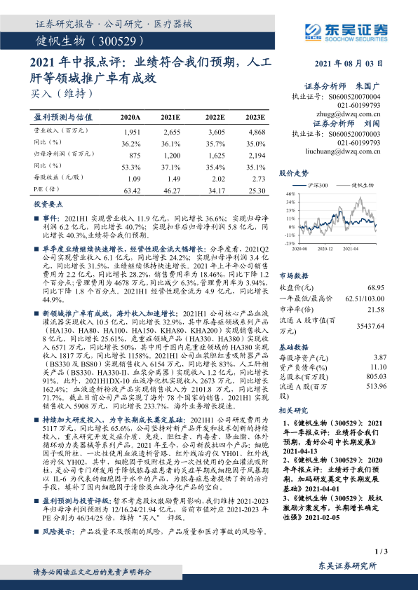 本报告对健帆生物(300529)2021年中报进行了分析,核心观点如下: