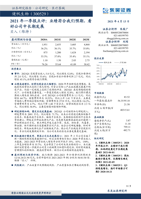 2021年第一季度,健帆生物实现营业收入5.8亿元,同比增长52.8%;实现归母净利润2.8亿元,同比增长53.6%;实现扣非后归母净利润2.7亿元,同比增长45.1%,业绩符合预期。