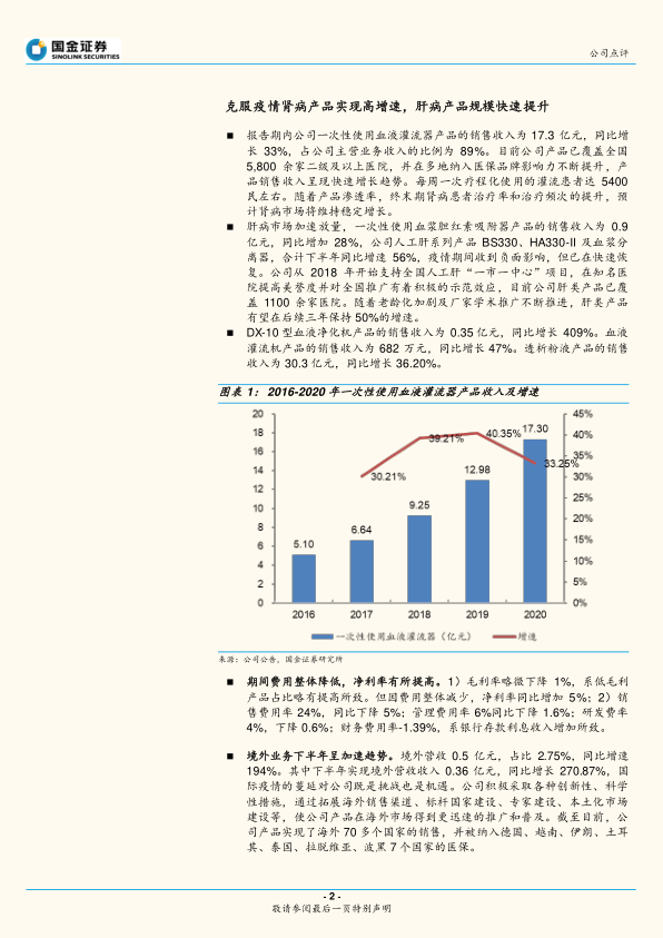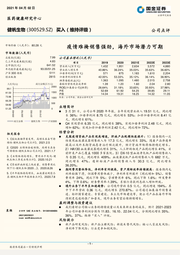 健帆生物在2020年年报中表现出色,克服疫情影响,实现了营收和利润的双增长。核心业务肾病产品线稳健增长,肝病产品线加速放量,新产品也呈现出良好的增长势头。公司期间费用控制有效,净利率有所提高,资产周转效率持续提升。同时,公司积极拓展海外市场,境外业务呈现加速增长态势。国金证券维持对公司“买入”评级,并预计未来三年公司业绩将保持快速增长。但同时也提示了新产品研发、注册、技术替代、人员流失、净利率下降以及行业竞争加剧等风险。