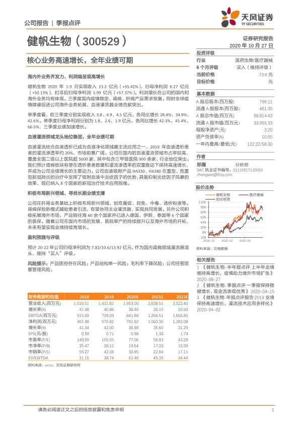 健帆生物 2020 年 1-9 月实现收入 13.2 亿元( +35.42%), 归母净利润 6.27 亿元( +50.13%),扣非后归母净利润 5.99 亿元( +57.37%)。 利润增长在公司的国内和海外业务均有体现。三季度国内疫情稳定,肾病、肝病产品需求恢复。 同时全球疫情肆虐促进公司海外业务拓展,血液灌流器业绩贡献突出。