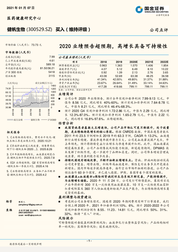 健帆生物2020年业绩预告超预期,归母净利润预计同比增长40%-60%。报告分析指出,业绩高增长的核心原因是: