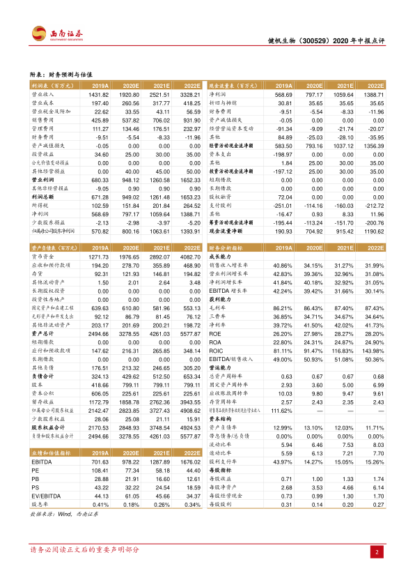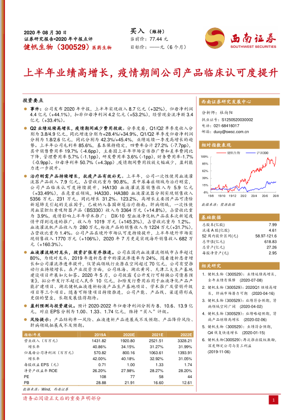 本报告对健帆生物2020年中报进行了深度分析,核心观点如下: