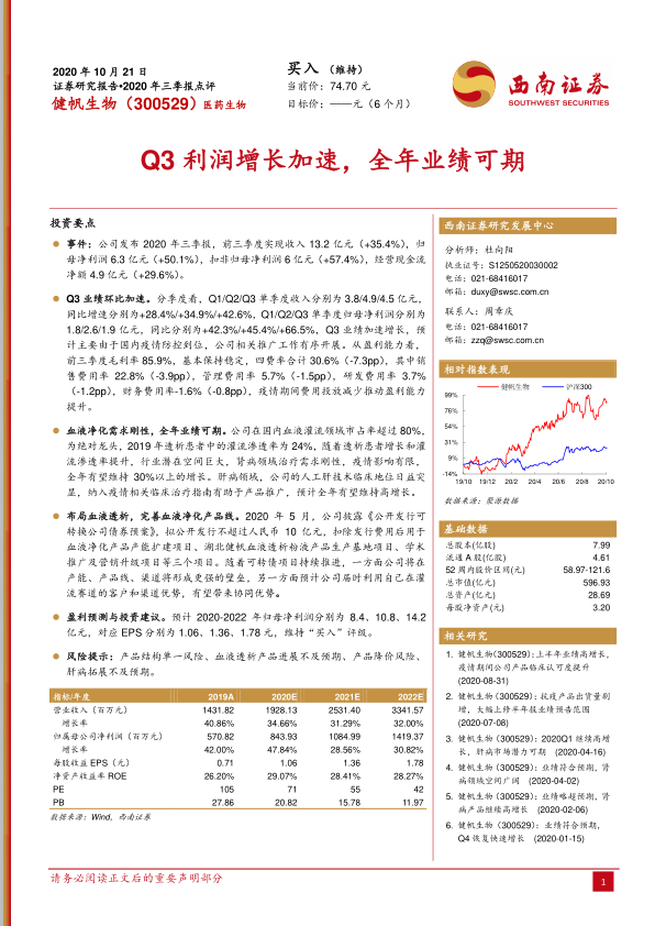 本报告对健帆生物2020年三季报进行了深入分析,公司Q3业绩加速增长,盈利能力提升,行业龙头地位稳固,未来发展潜力巨大。公司通过布局血液透析,完善血液净化产品线,有望进一步增强市场竞争力。维持“买入”评级,但需关注产品结构单一、血液透析产品进展不及预期以及产品降价等风险。