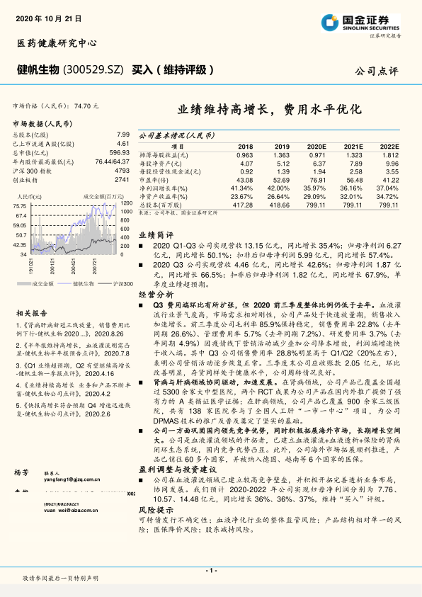 本报告分析了健帆生物2020年前三季度的业绩表现,指出公司在营收和利润方面均实现了显著增长,并通过有效的费用控制提升了盈利能力。公司在肾病和肝病领域协同发展,同时积极拓展国内外市场,为长期增长奠定了基础。维持“买入”评级,并对公司未来的盈利能力进行了预测。