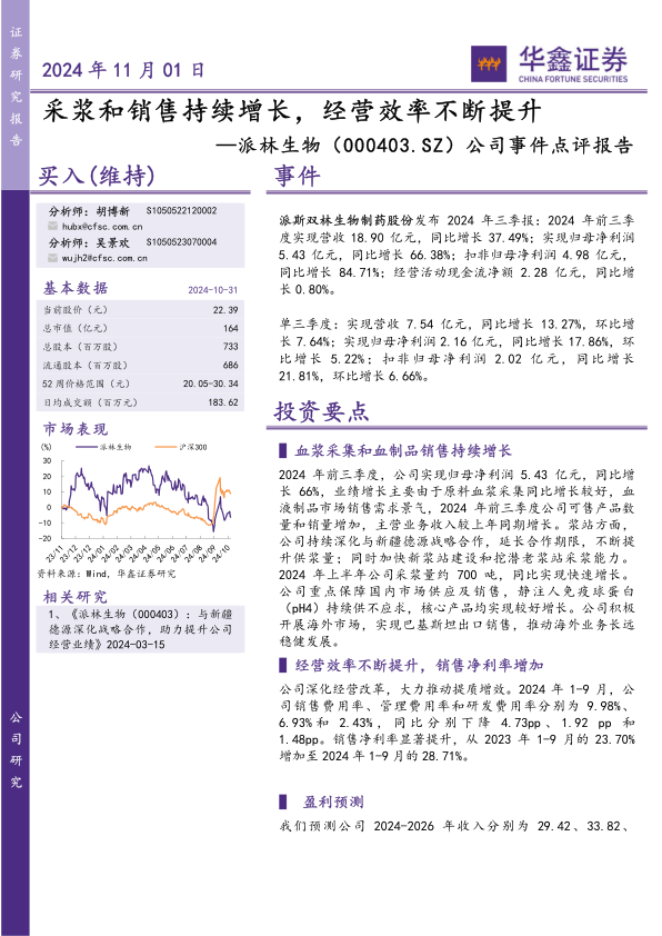 2024年前三季度,公司实现归母净利润5.43亿元,同比增长66%,业绩增长主要由于原料血浆采集同比增长较好,血液制品市场销售需求景气,2024年前三季度公司可售产品数量和销量增加,主营业务收入较上年同期增长。浆站方面,公司持续深化与新疆德源战略合作,延长合作期限,不断提升供浆量;同时加快新浆站建设和挖潜老浆站采浆能力。2024年上半年公司采浆量约700吨,同比实现快速增长。公司重点保障国内市场供应及销售,静注人免疫球蛋白(pH4)持续供不应求,核心产品均实现较好增长。公司积极开展海外市场,实现巴基斯坦出口销售,推动海外业务长远稳健发展。