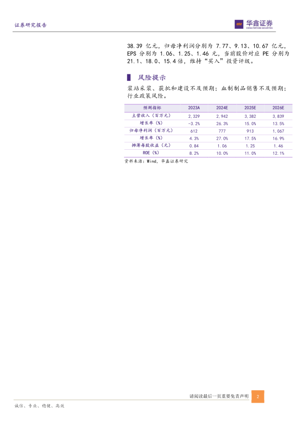 我们预测公司2024-2026年收入分别为29.42、33.82、38.39亿元,归母净利润分别为7.77、9.13、10.67亿元,EPS分别为1.06、1.25、1.46元,当前股价对应PE分别为21.1、18.0、15.4倍,维持“买入”投资评级。
