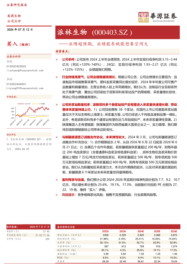 本报告对派林生物的最新业绩进行了分析,认为公司业绩超出预期,主要受益于血制品行业的高景气度和公司采浆量的增长。公司采浆站数量较多,未来增长潜力巨大,陕煤集团的入主和与新疆德源的战略合作也将为公司带来更多发展机遇。维持“买入”评级,但同时也提示了竞争格局恶化、销售不及预期和行业政策风险等风险因素。