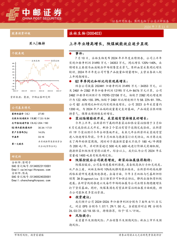 本报告对派林生物2024年上半年的业绩进行了分析,认为公司业绩增长主要受益于血液制品市场需求旺盛和采浆量提升。陕煤控股后,公司在产品研发、海外市场拓展和浆站资源获取方面均取得积极进展,未来发展潜力巨大。维持“买入”评级,但需关注采浆量、产品销售和新品上市等风险。