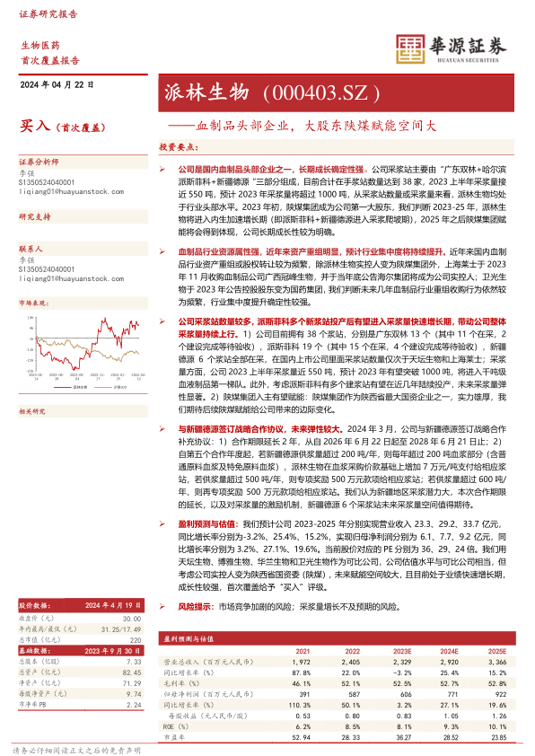 派林生物在2023年实现营业收入23.3亿元,同比下滑3.2%,归母净利润6.1亿元,同比增长4.2%。尽管2023年营收略有下滑,但归母净利润保持增长,且2024年一季度业绩表现强劲,预计归母净利润为1.1-1.3亿元,同比增长100%-130%,主要得益于血液制品市场销售需求的景气和2023年同期基数较低。基于公司采浆量未来几年有望持续高增长以及吨浆利润的改善空间,报告预计2023-2025年公司营业收入将分别达到23.3亿元、29.2亿元、33.7亿元,同比增长率分别为-3.2%、25.4%、15.2%;归母净利润将分别达到6.1亿元、7.7亿元、9.2亿元,同比增长率分别为3.2%、27.1%、19.6%。当前股价对应的PE分别为36倍、29倍、24倍。考虑到陕煤集团的赋能空间和公司强劲的成长性,报告首次覆盖给予“买入”评级。主要风险提示包括采浆量增长不及预期和市场竞争加剧。