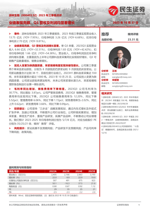 派林生物2023年三季报显示,公司Q3业绩表现亮眼,营收和利润均实现显著增长,主要受益于采浆量增加和产品销售增长。公司浆站数量位居行业前列,实控人变更后,采浆规模有望实现突破。同时,公司毛利率同比增加,销售费用率下降明显。维持对公司“推荐”评级,但需关注浆站拓展、产品研发、毛利率以及政策等风险。