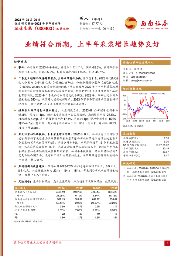 本报告对派林生物2023年半年报进行了全面分析,公司业绩符合预期,二季度业绩环比改善明显,全年业绩预计呈现前低后高趋势。黑龙江浆站陆续获批,未来浆量增长潜力大,若实际控制人变更为陕西国资委,浆站数量有望进一步增加。报告维持对派林生物“买入”评级,但同时也提示了投资者需要关注的风险因素。