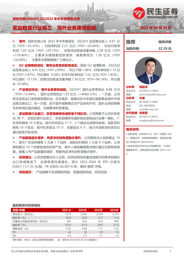派林生物 2022 年半年度报告显示,公司业绩稳步增长,浆站数量行业领先,采浆规模快速扩张,海外业务取得显著进展。公司通过并购整合和产品研发,有望进一步提升盈利能力。维持“推荐”评级,但需关注产品销售、质量控制和研发等方面的风险。