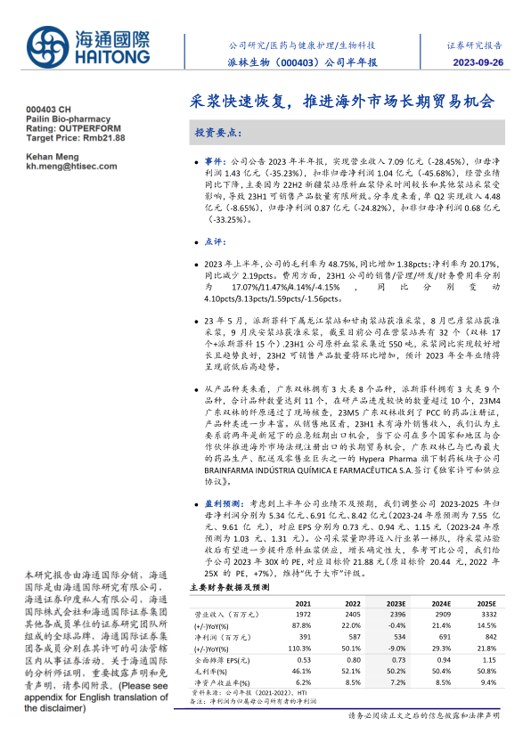 公司半年报:采浆快速恢复,推进海外市场长期贸易机会