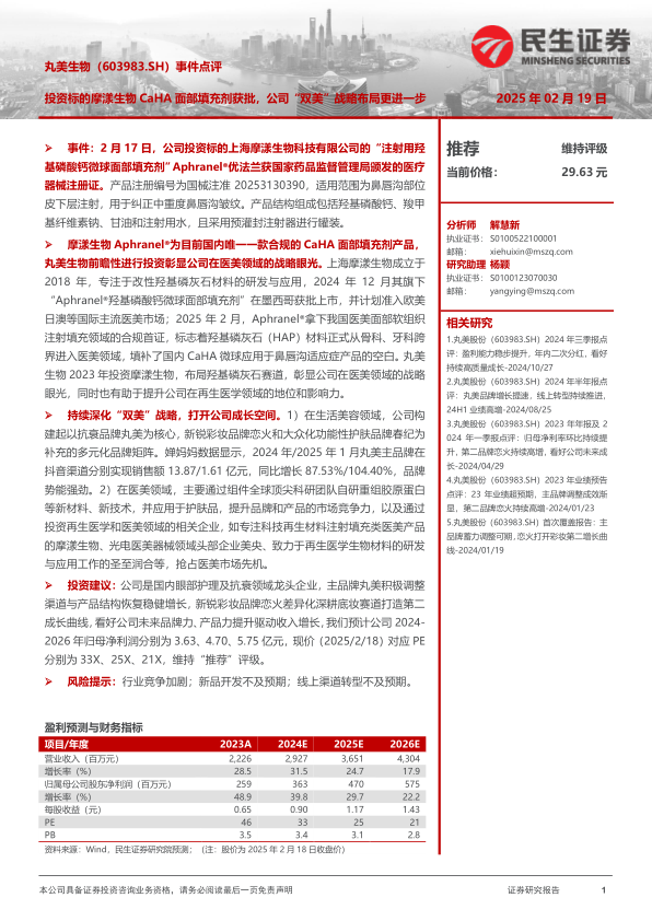 丸美生物通过投资摩漾生物,成功推动国内首款合规CaHA面部填充剂获批,显著深化了其在医美领域的战略布局,填补了市场空白,并彰显了公司在再生医学领域的战略远见。结合其在生活美容领域多元品牌矩阵的强劲增长,丸美生物的“双美”战略正稳步推进,有望持续打开公司成长空间。尽管面临行业竞争加剧、新品开发及线上转型不及预期等风险,但公司凭借其在眼部护理及抗衰领域的龙头地位,以及主品牌和新锐品牌的协同发展,预计未来盈利能力将持续提升,报告维持“推荐”评级。