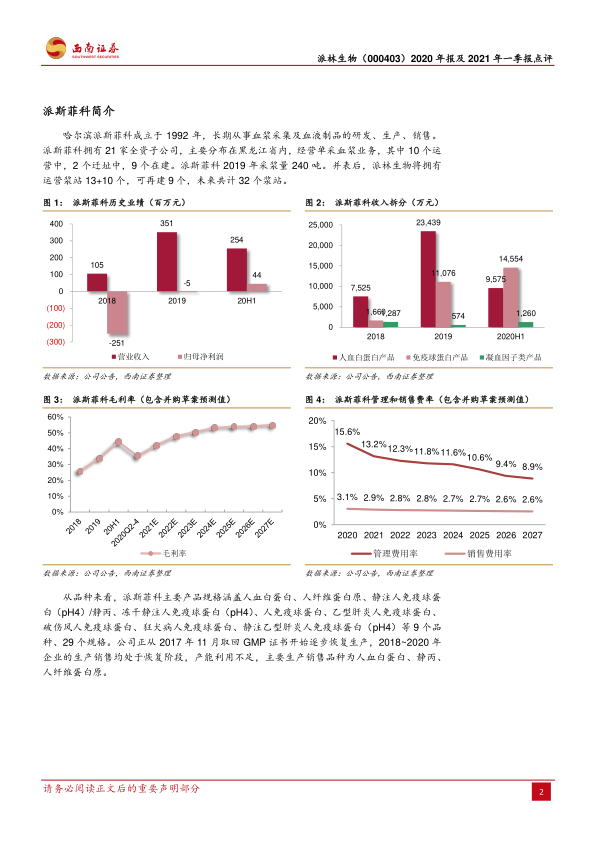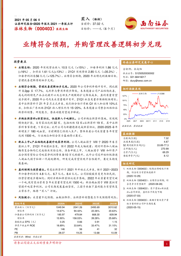 本报告对派林生物2020年年报及2021年一季报进行了深入分析,核心观点如下: