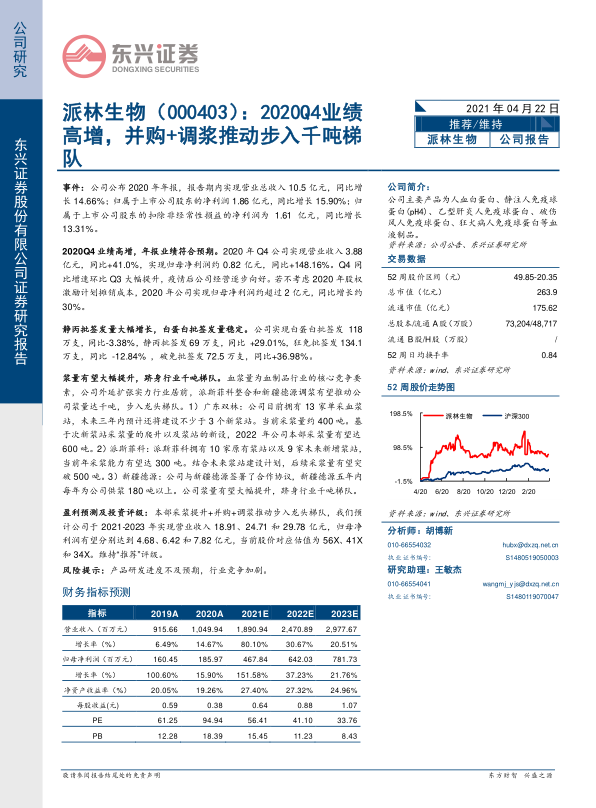 报告分析了派林生物2020年业绩,并对未来三年业绩进行了预测,强调了公司在血制品行业的增长潜力。
