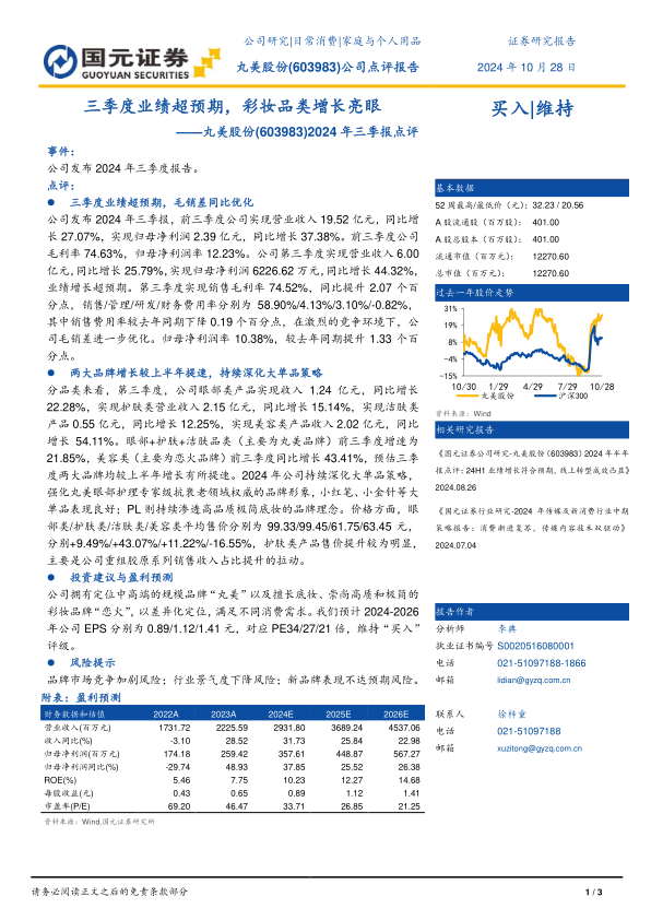 国元证券维持丸美股份“买入”评级,并预测公司2024-2026年EPS分别为0.89元、1.12元和1.41元,对应PE分别为34倍、27倍和21倍。公司凭借定位中高端的“丸美”品牌和擅长底妆、崇尚高质极简的彩妆品牌“恋火”,形成了差异化的市场定位,以满足多元化的消费需求。