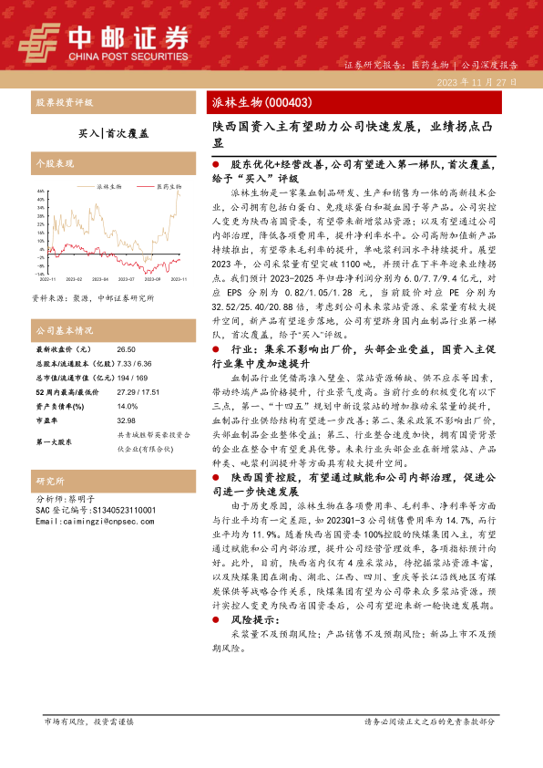 派林生物在陕西国资委通过陕煤集团入主后,正迎来一个全面的战略升级和业绩爆发期。此次股权变更不仅为公司带来了稀缺的浆站资源和强大的资本支持,更将通过优化内部管理、降低运营成本,显著提升公司的盈利能力。在血制品行业高准入壁垒、供不应求的背景下,国家政策对浆站扩容的支持以及集采政策的温和影响,为派林生物提供了有利的外部环境。公司凭借其领先的采浆站数量、丰富的产品种类以及在研产品和出海业务的持续推进,有望在2023年下半年迎来业绩拐点,并加速跻身国内血制品行业第一梯队。我们预计公司2023-2025年归母净利润将分别达到6.0/7.7/9.4亿元,对应EPS分别为0.82/1.05/1.28元,当前估值与同类公司相比具有一定优势,首次覆盖给予“买入”评级。投资者需关注采浆量不及预期、产品销售不及预期以及新品上市不及预期等风险。