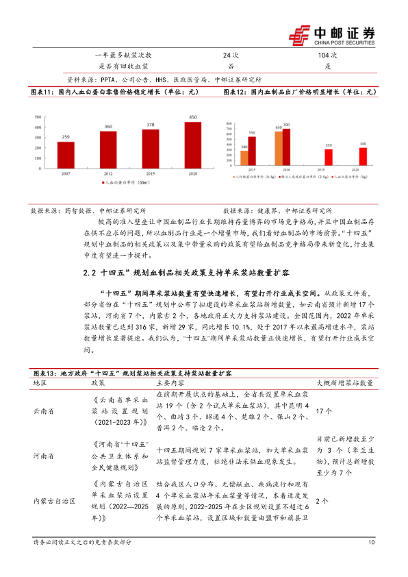血制品行业凭借高准入壁垒、浆站资源稀缺、供不应求等因素,带动终端产品价格提升,行业景气度高。当前行业的积极变化有以下三点,第一、“十四五”规划中新设浆站的增加推动采浆量的提升,血制品行业供给结构有望进一步改善;第二、集采政策不影响出厂价,头部血制品企业整体受益;第三、行业整合速度加快,拥有国资背景的企业在整合中有望更具优势。未来行业头部企业在新增浆站、产品种类、吨浆利润提升等方面具有较大提升空间。