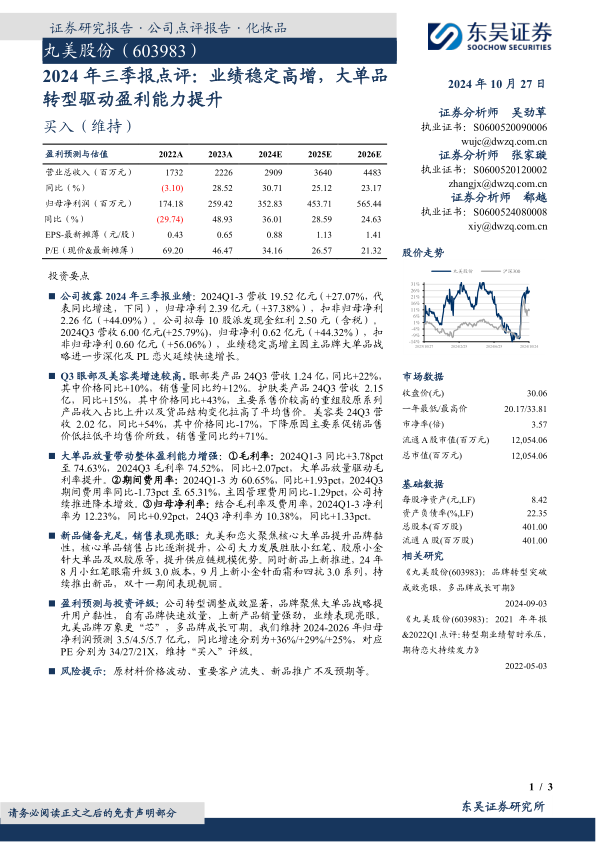 盈利预测与投资评级:公司转型调整成效显著,品牌聚焦大单品战略提升用户黏性,自有品牌快速放量,上新产品销量强劲,业绩表现亮眼。丸美品牌万象更“芯”,多品牌成长可期。我们维持2024-2026年归母净利润预测3.5/4.5/5.7亿元,同比增速分别为+36%/+29%/+25%,对应PE分别为34/27/21X,维持“买入”评级。