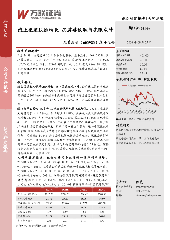 丸美股份在2024年上半年表现良好,线上渠道的快速增长和品牌建设的积极推进是其亮点。公司通过深化大单品策略和加强品牌营销,有效提升了市场竞争力。然而,销售费用率的增加对净利率的提升构成了一定压力,未来需要关注公司在成本控制和盈利能力提升方面的表现。维持“增持”评级,但需关注宏观经济、线上增速和市场竞争等风险因素。