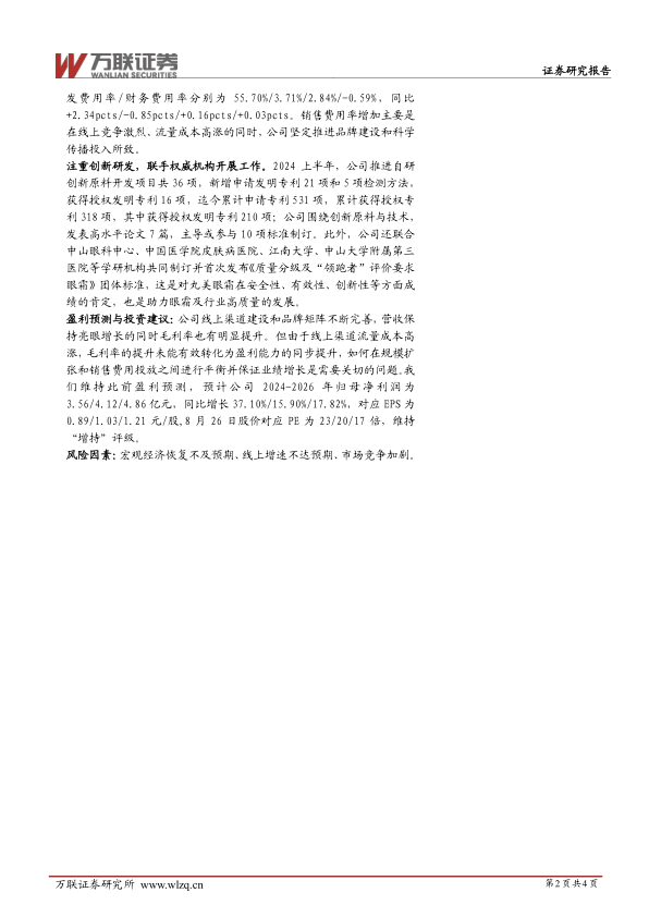 盈利预测与投资建议:公司线上渠道建设和品牌矩阵不断完善,营收保持亮眼增长的同时毛利率也有明显提升。但由于线上渠道流量成本高涨,毛利率的提升未能有效转化为盈利能力的同步提升,如何在规模扩张和销售费用投放之间进行平衡并保证业绩增长是需要关切的问题。我们维持此前盈利预测,预计公司2024-2026年归母净利润为3.56/4.12/4.86亿元,同比增长37.10%/15.90%/17.82%,对应EPS为0.89/1.03/1.21元/股,8月26日股价对应PE为23/20/17倍,维持“增持”评级。