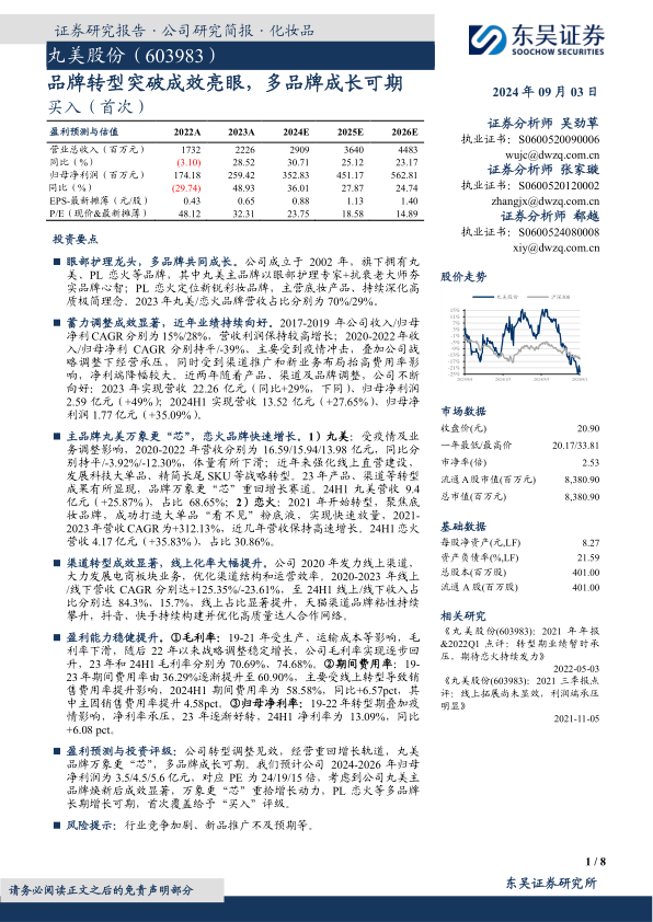 盈利预测与投资评级:公司转型调整见效,经营重回增长轨道,丸美品牌万象更“芯”,多品牌成长可期。我们预计公司2024-2026年归母净利润为3.5/4.5/5.6亿元,对应PE为24/19/15倍,考虑到公司丸美主品牌焕新后成效显著,万象更“芯”重拾增长动力,PL恋火等多品牌长期增长可期,首次覆盖给予“买入”评级。
