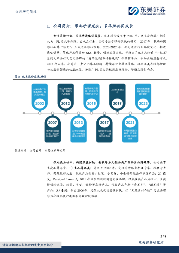 眼部护理龙头,多品牌共同成长。公司成立于2002年,旗下拥有丸美、PL恋火等品牌,其中丸美主品牌以眼部护理专家+抗衰老大师夯实品牌心智;PL恋火定位新锐彩妆品牌,主营底妆产品、持续深化高质极简理念。2023年丸美/恋火品牌营收占比分别为70%/29%。