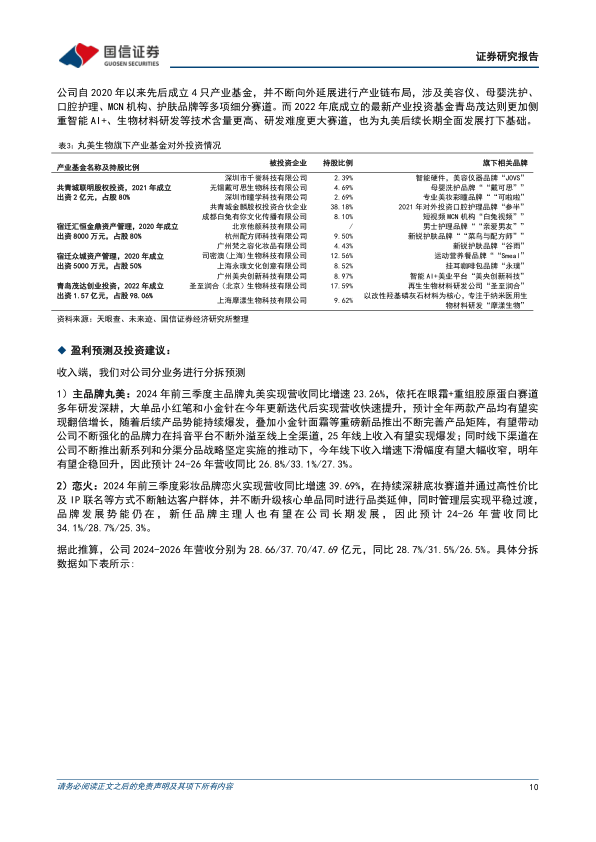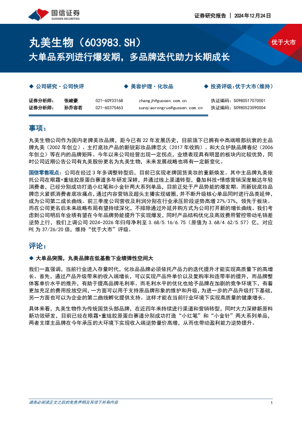 国信零售观点: 公司在经过 3 年多调整转型后, 目前已实现老牌国货美妆的重新焕发。 其中主品牌丸美依托公司在眼霜+重组胶原蛋白赛道多年研发深耕, 并通过线上渠道转型, 叠加科技+情感营销深度触达年轻消费者, 已经分别成功打造小红笔和小金针两大系列单品, 目前正处于产品势能的爆发期。 而新锐底妆品牌恋火紧抓消费者底妆痛点, 通过内容营销及超头主播实现破圈, 并不断升级核心单品同时进行品类延伸,成为公司第二成长曲线。 前三季度公司营收及利润分别在行业承压阶段逆势高增 27%/37%, 领先于板块。而在公司更名后未来战略布局有望持续深化, 不排除通过外延并购方式为公司打开新的增长曲线。 我们考虑到公司明后年业绩有望在今年品牌势能提升下实现爆发, 同时产品结构优化及高效费用管控带动毛销差逆势上行, 我们上调公司 2024-2026 年归母净利至 3.68/5.16/6.75(原值为 3.68/4.62/5.57) 亿, 对应PE 为 37/26/20 倍, 维持“优于大市” 评级。