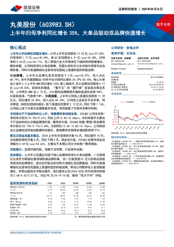 投资建议:上半年公司通过对旗下核心品牌持续深化大单品策略,一方面强化丸美作为眼部抗衰领域权威品牌形象,另一方面渗透PL恋火的高品质极简底妆的品牌理念,成功在护肤及彩妆两大领域扎深品牌基础。同时分渠道精细化运营有效巩固线上渠道转型的积极成果,带动公司整体收入呈现稳健增长,并带动盈利水平稳步提升。我们维持公司2024-2026年归母净利预测为3.68/4.62/5.57亿,对应PE为24/19/16倍,维持“优大于市”评级。