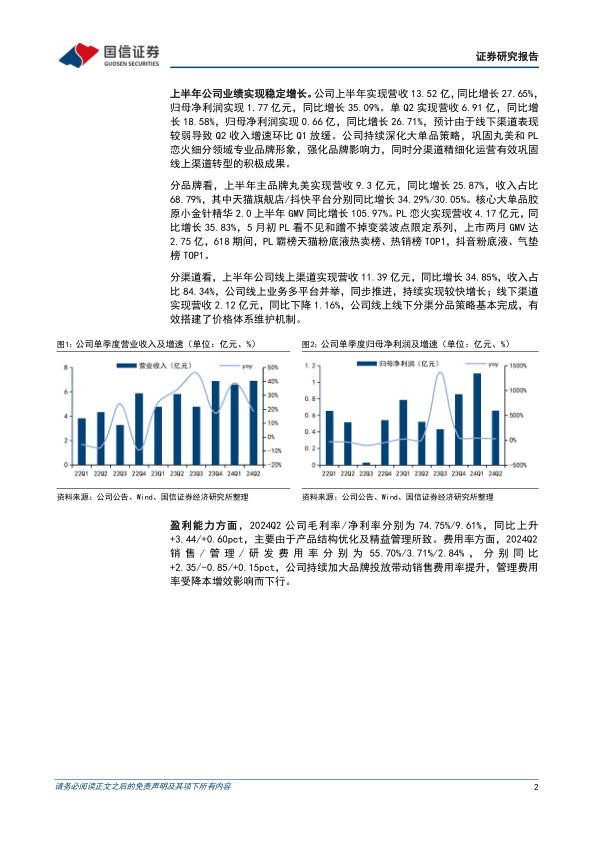 上半年公司业绩实现稳定增长。公司上半年实现营收13.52亿/yoy+27.65%,归母净利1.77亿/yoy+35.09%。单Q2实现营收6.91亿/yoy+18.58%,归母净利0.66亿/yoy+26.71%,在二季度行业大环境承压下继续保持稳健增长。整体来看,公司持续深化大单品策略,巩固丸美和恋火各自细分领域专业品牌形象,同时分渠道精细化运营有效巩固线上渠道转型的积极成果。